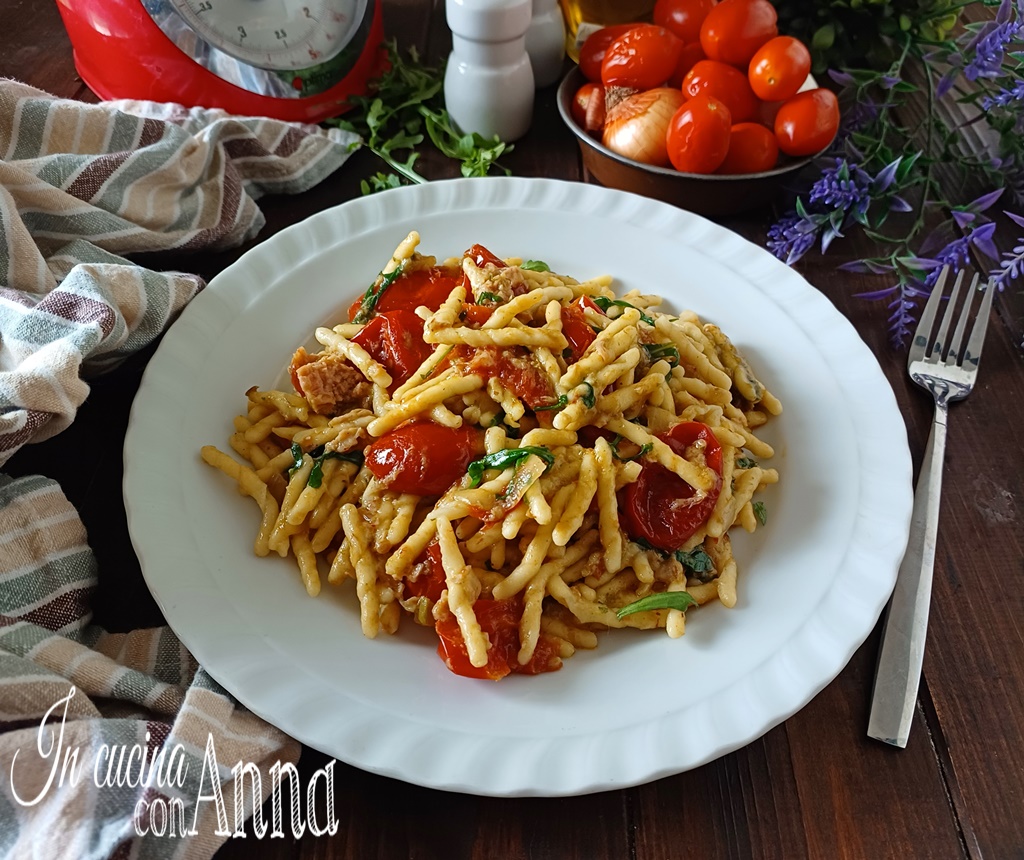 Ajoutez la roquette restante en morceaux aux tomates cerises qui entre-temps ont cuit et vous avez éteint le feu, ajoutez également un tour de moulin à poivre et le thon égoutté un peu d’huile, ajoutez le pesto de roquette préparé précédemment, mélangez le tout (je n’ajoute pas de sel car il y a la ricotta salée, goûtez si la saveur est à votre goût).
