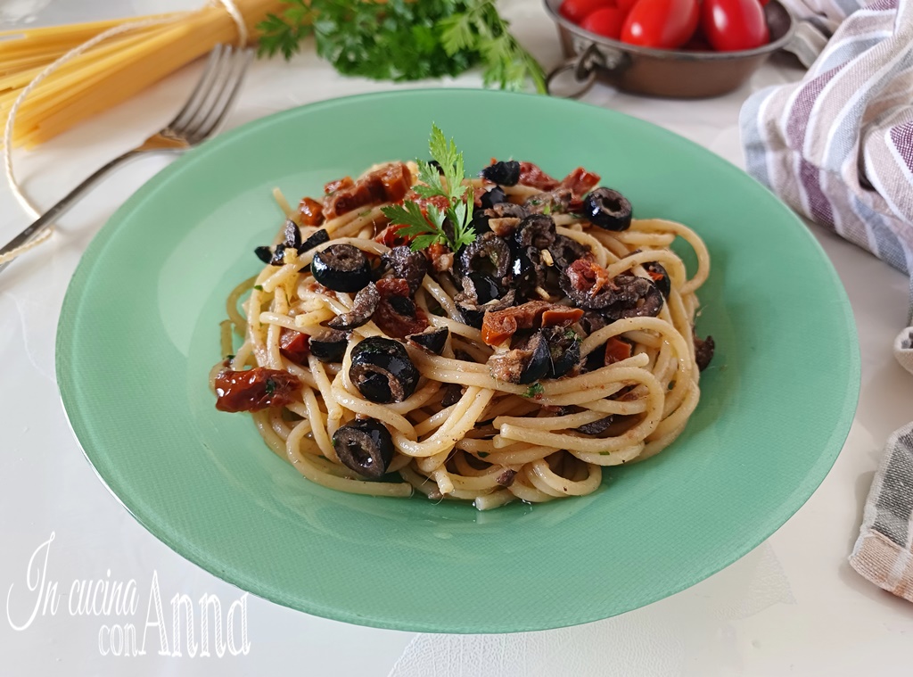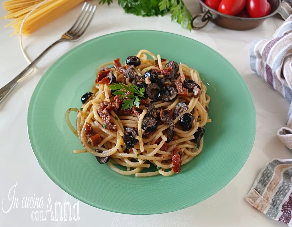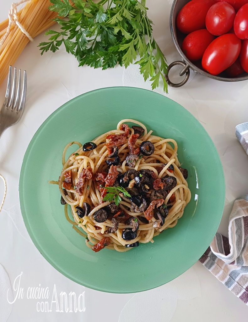 Prenez une grande poêle, ajoutez un généreux filet d’huile, l’ail, les anchois, du piment selon votre goût (si vous ne le préférez pas ou s’il y a des enfants, vous pouvez aussi ne pas en mettre) et un tour de moulin à poivre, allumez le feu au minimum et faites frémir jusqu’à ce que, à l’aide d’une cuillère en bois, les anchois fondent, ajoutez également les olives et les tomates séchées, laissez aromatiser un moment et éteignez le feu, ajoutez le persil haché.