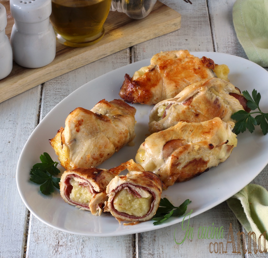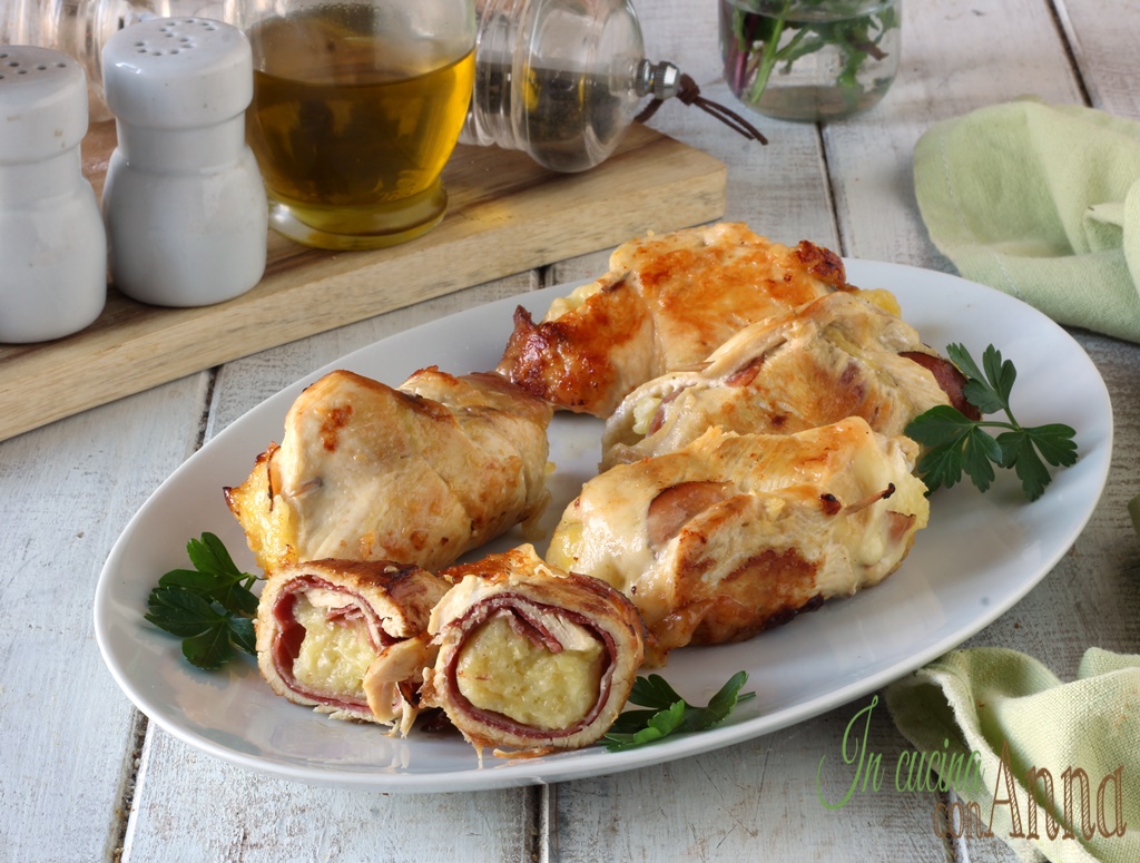 Garnissez les tranches de poulet (ou de votre viande préférée) en les étalant une à la fois sur un plan de travail, recouvrez d’une tranche de speck et mettez les pommes de terre au centre, enroulez la tranche de viande sur elle-même pour former les roulés et fermez avec un cure-dent en bois.