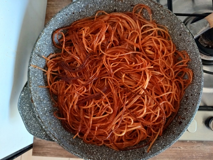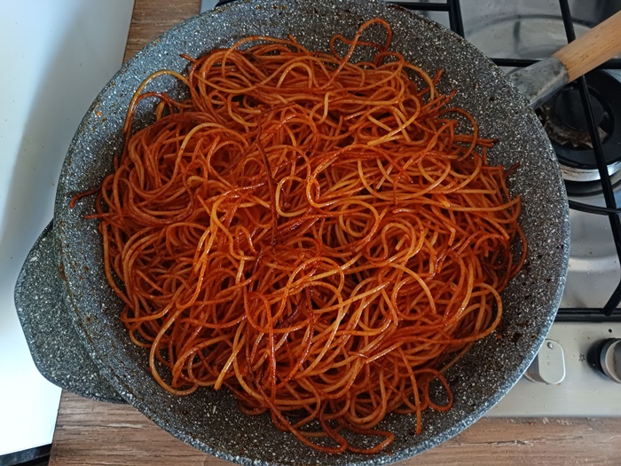 Continuez la cuisson des pâtes en les faisant frire jusqu’à ce qu’elles deviennent bien grillées, les spaghetti doivent former une croûte brunâtre.
