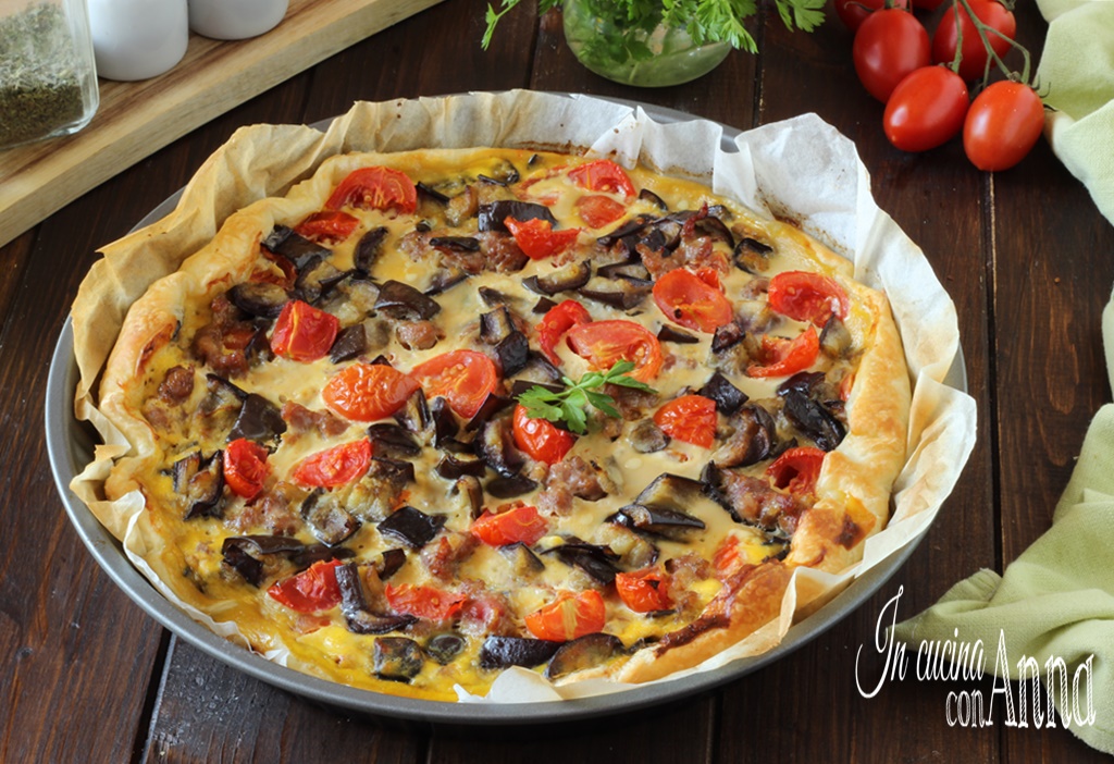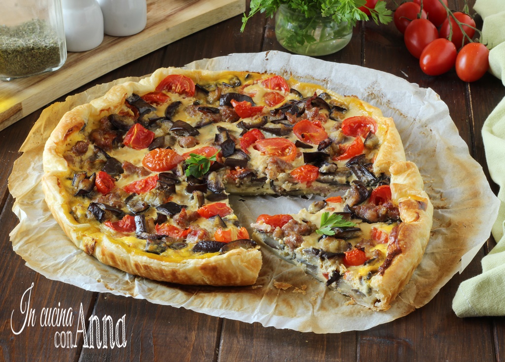La tarte salée aux aubergines, saucisse, stracchino et tomates cerises est une tarte rustique très simple à préparer, très goûteuse et délicieuse, sa pâte feuilletée et sa garniture crémeuse et savoureuse avec beaucoup de légumes en font un plat parfait pour le dîner, dans un buffet, comme entrée et pas seulement, je vous conseille de l’essayer, vous verrez qu’elle conquerra tout le monde dès la première bouchée.
