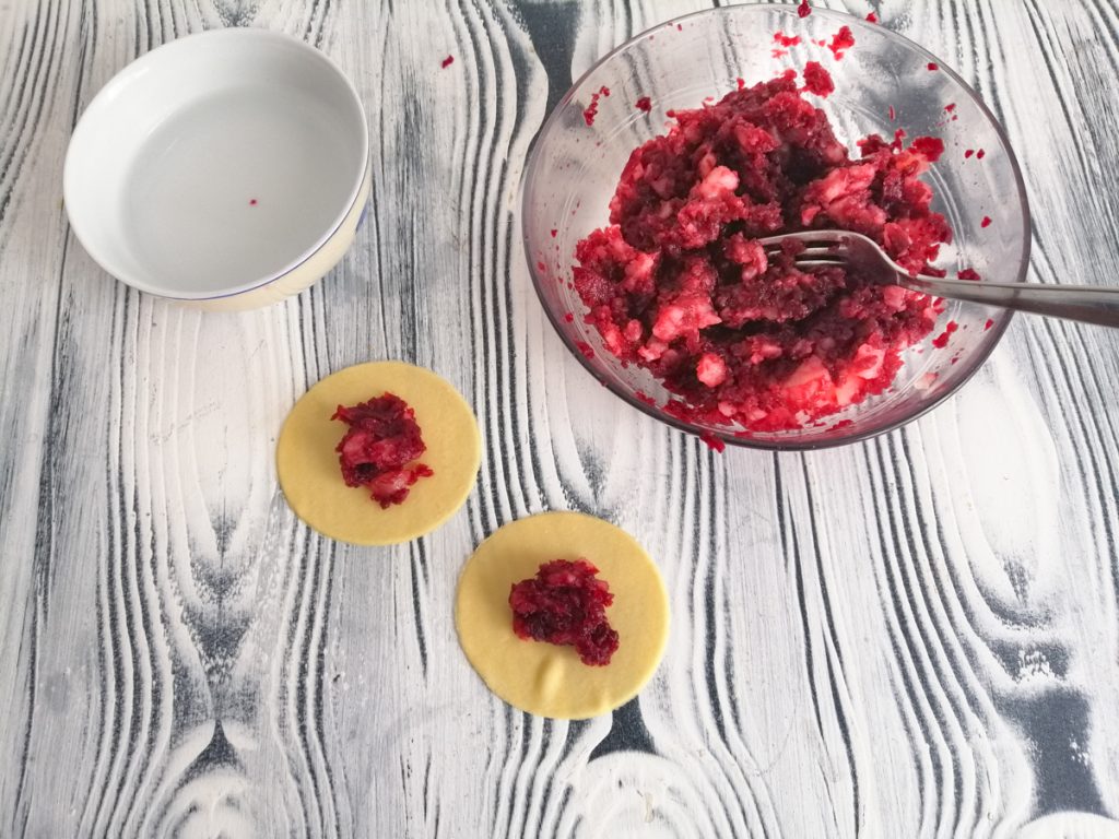 Les casunziei ampezzani se préparent avec une farce de betteraves rouges et de pommes de terre et une pâte aux œufs étirée très finement, qui laisse apparaître le rouge de la farce une fois cuite.