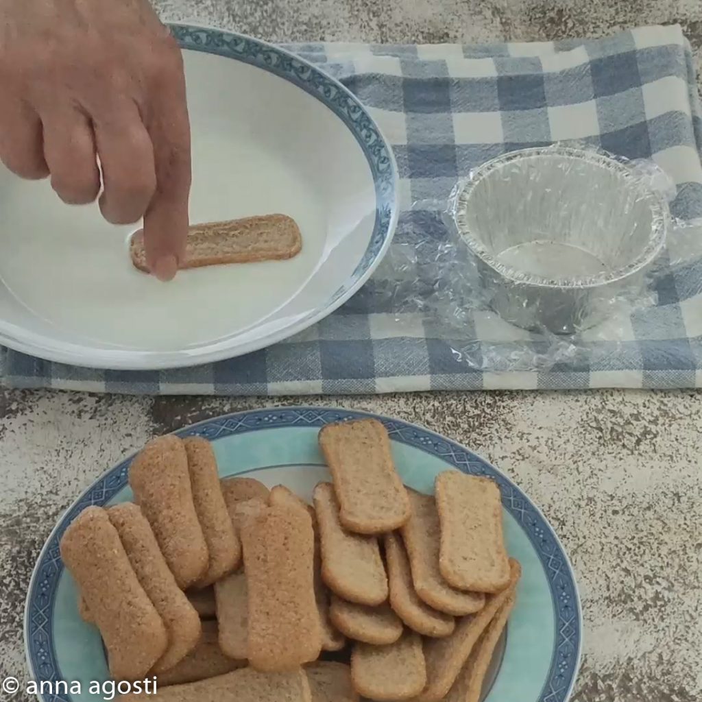 Trempez un Pavesini à la fois dans le lait et couvrez les côtés de chaque moule sans laisser d’espaces vides.