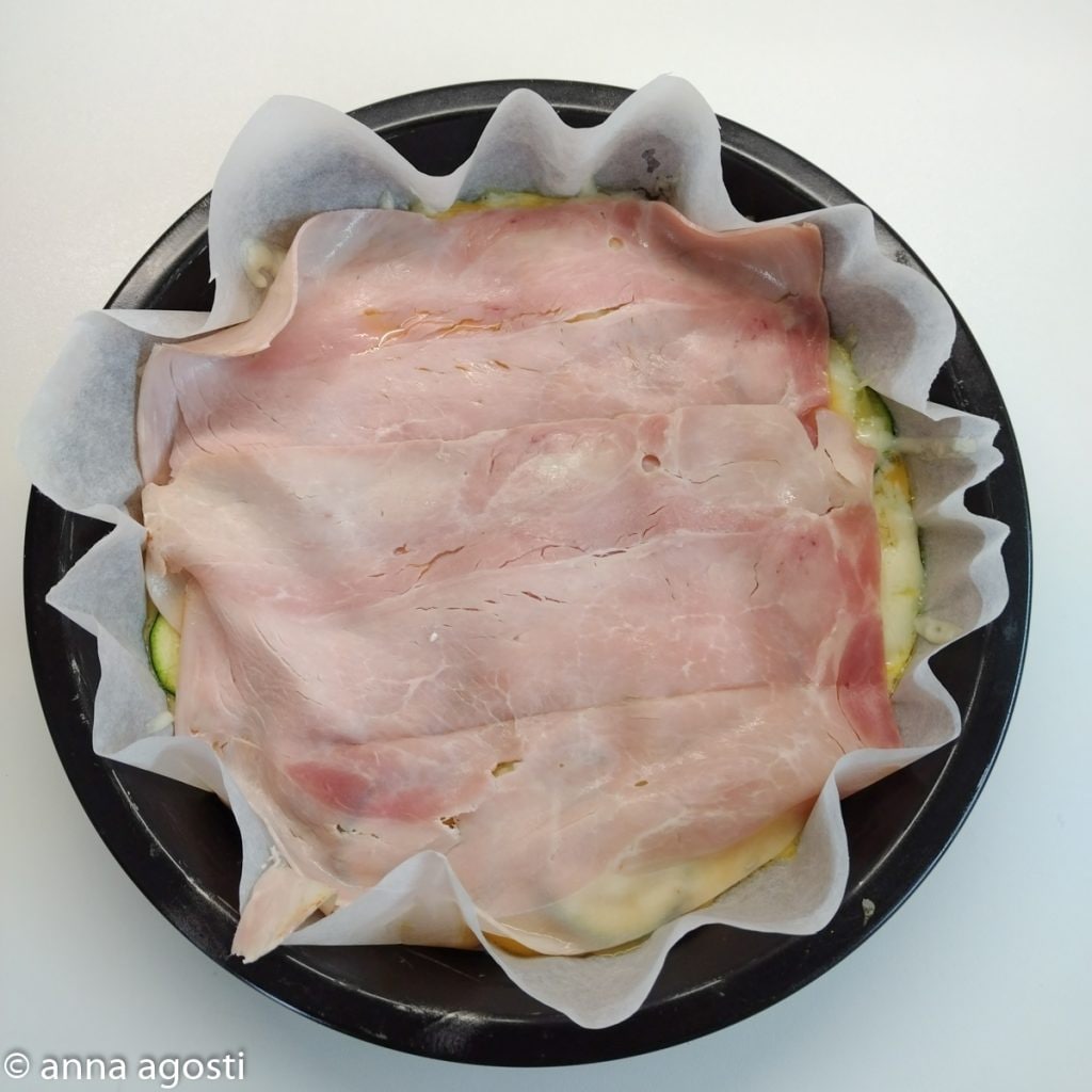 Répartissez dessus le fromage coupé en tranches et le jambon cuit pour couvrir tout le moule.
