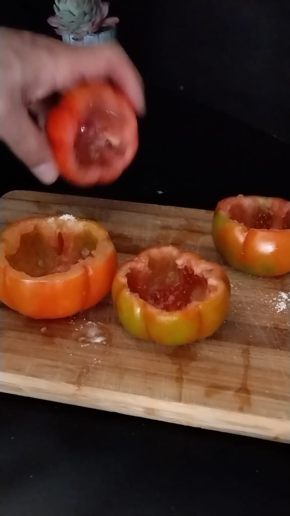 Pour préparer les tomates farcies gratinées, commencez par laver les tomates, coupez le chapeau en le réservant de côté et videz-les.