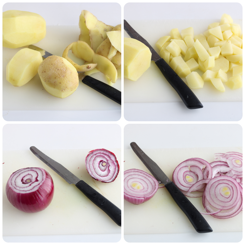 Lavez et épluchez les pommes de terre, puis coupez-les en petits dés, afin qu’elles cuisent mieux et de manière uniforme.