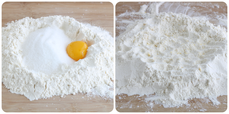 Sur un plan de travail, tamisez la farine avec la levure, disposez-la en fontaine et au centre mettez le sucre, un jaune d’œuf, une pincée de sel et une fiole d’arôme citron.