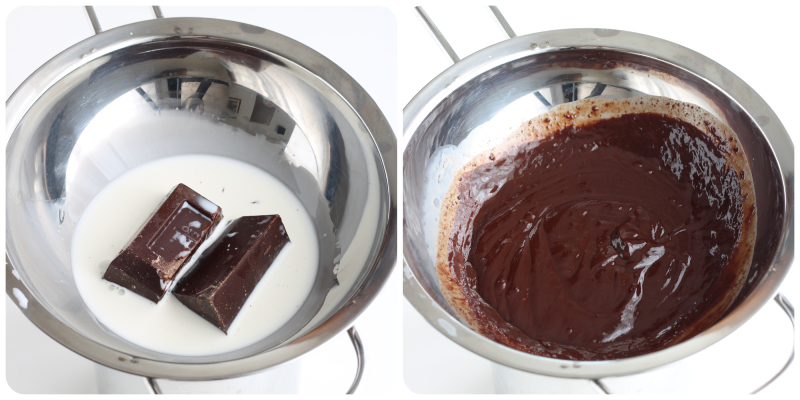 • Pendant ce temps, faites fondre au bain-marie (ou au micro-ondes) le chocolat noir avec la crème liquide, laissez refroidir et mettez-le dans une poche à douille.