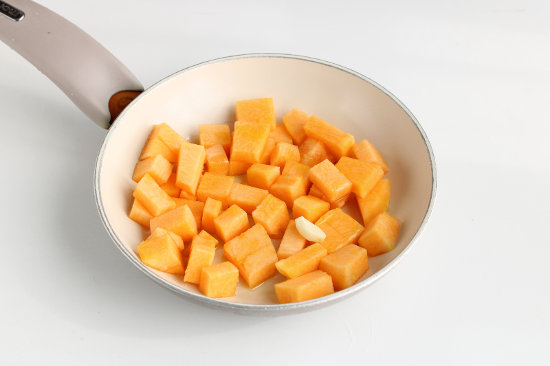 Coupez la citrouille d’abord en quartiers puis en morceaux en retirant la peau. Dans une poêle antiadhésive, ajoutez un filet d’huile et disposez la citrouille. Si pendant la cuisson elle colle trop à la poêle, vous pouvez ajouter quelques cuillères à soupe d’eau.
