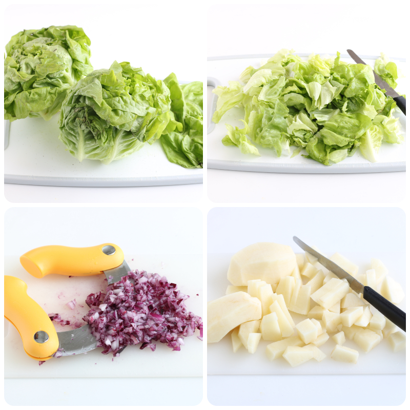 Dans une casserole, faites revenir l’huile avec l’oignon, ajoutez la laitue et laissez-la flétrir (réservez quelques feuilles pour la garniture du plat), puis ajoutez les pommes de terre coupées en morceaux.