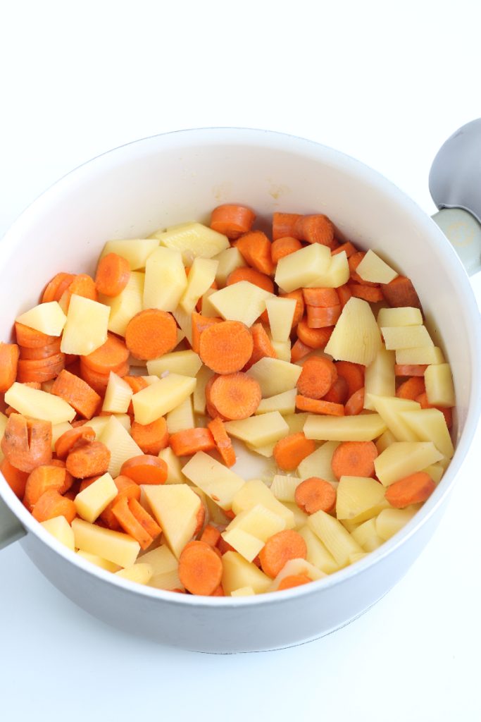 Lavez les pommes de terre et les carottes. Avec un épluche-légumes enlevez la peau des pommes de terre et coupez-les en petits morceaux, puis grattez les carottes et coupez-les en rondelles.