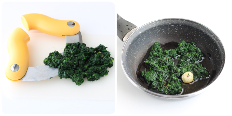 Une fois que les épinards sont cuits, hachez-les finement avec un couteau demi-lune et faites-les sauter quelques minutes dans une poêle avec de l’huile et une gousse d’ail, salez et servez.