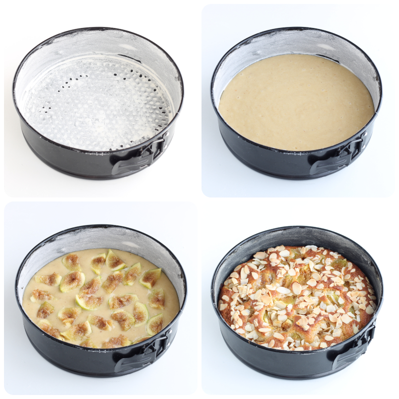 Beurrez et farinez un moule à charnière de 22 cm, versez la pâte, puis disposez les figues par-dessus de manière uniforme et faites de même avec les amandes effilées.