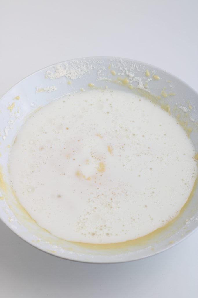 Versez ensuite le lait (utilisez toujours le pot de yaourt pour la mesure), enfin ajoutez la levure chimique pour gâteaux et mélangez jusqu’à obtenir une pâte lisse et homogène.