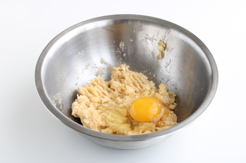 Écrasez avec une fourchette le beurre avec le sucre puis ajoutez un œuf entier.