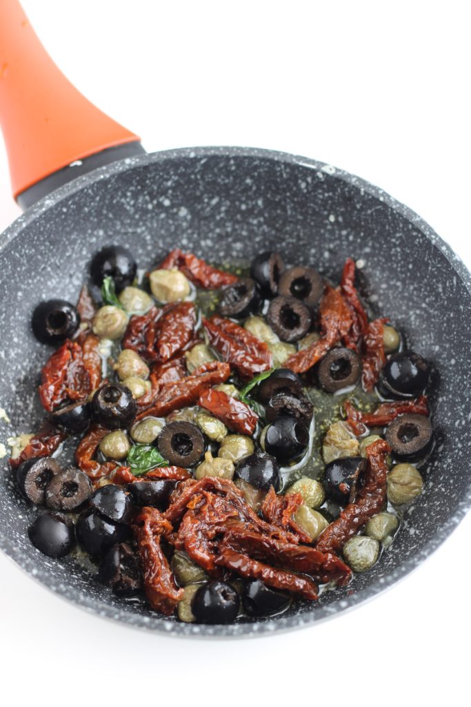 Faites revenir dans une poêle l’huile avec l’ail haché et un petit piment (facultatif), dès que l’ail commence à dorer, ajoutez les tomates séchées, les olives, les câpres dessalées, quelques feuilles de basilic et faites revenir le tout pendant quelques minutes.