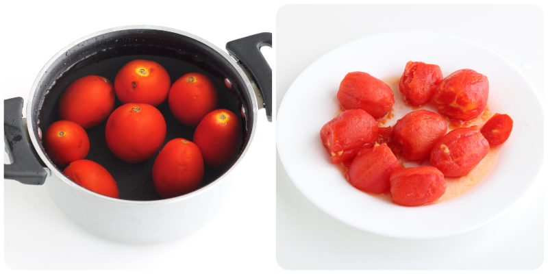 Lorsque la peau commence à se fendre, égouttez-les avec une écumoire, déposez-les dans un bol d’eau froide pour les refroidir, puis vous pourrez facilement retirer la peau.