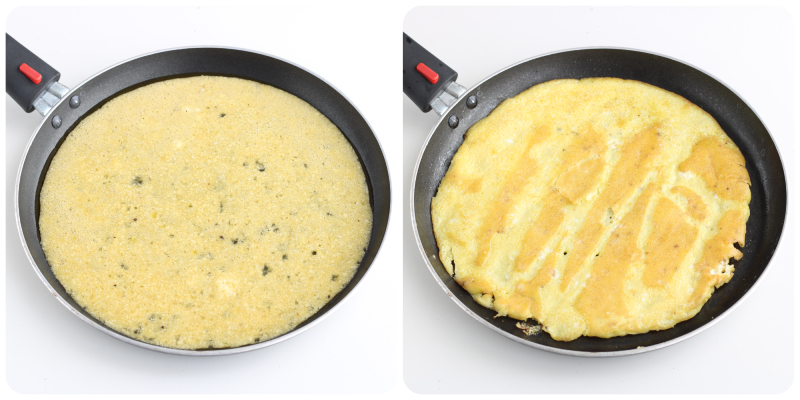 Versez le mélange d’œufs dans une poêle antiadhésive et faites cuire l’omelette, en la retournant à mi-cuisson