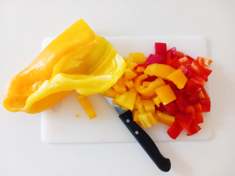 Lavez les poivrons, retirez les pédoncules et les filaments internes, puis coupez-les en morceaux.