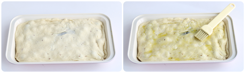 • Une fois que la pâte a levé, il est temps de donner forme à la schiacciata avec les raisins.