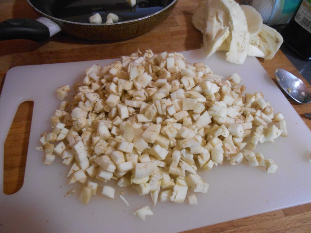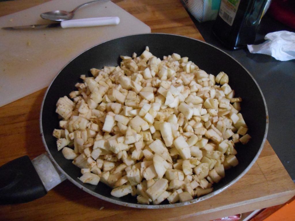 Pendant ce temps, coupez la pulpe des aubergines en dés.