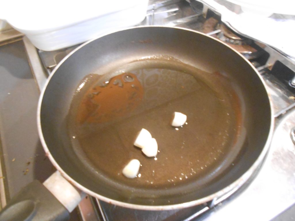Maintenant, dans une poêle versez l’huile d’olive et ajoutez l’ail.