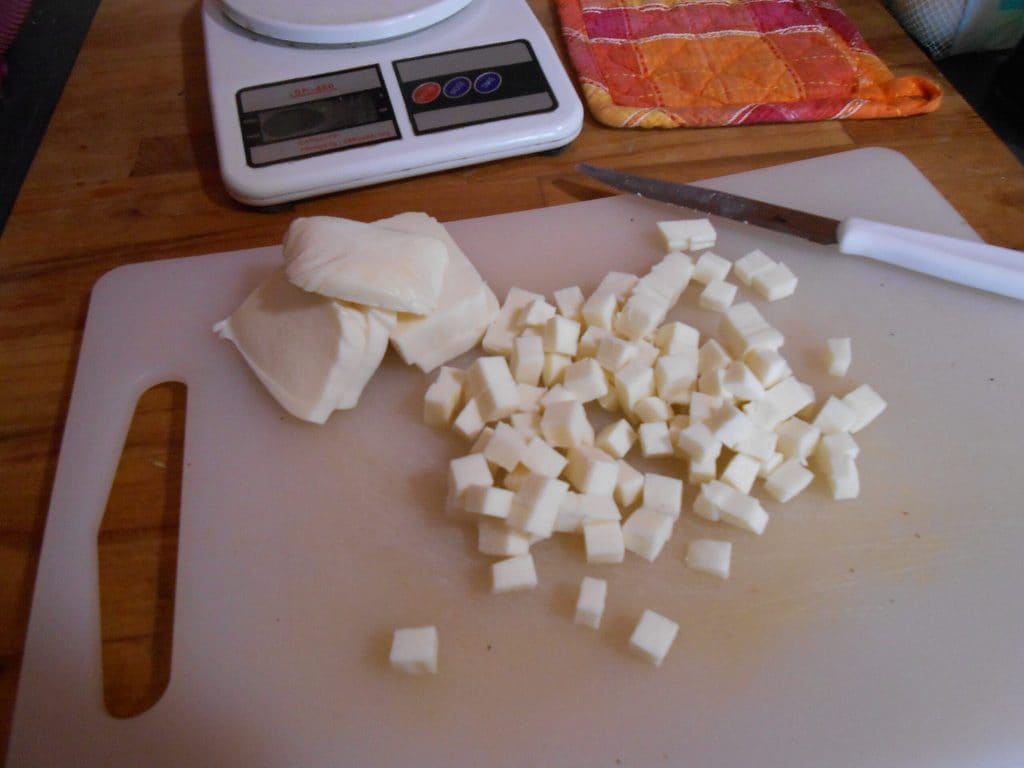 Pendant ce temps, coupez la mozzarella en dés, à peu près de la même taille que les aubergines.