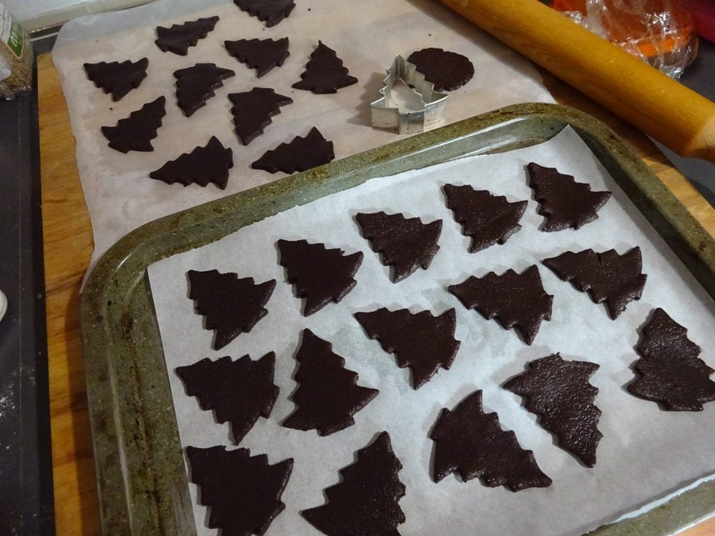 Biscuits de Noël avec pâte sablée à l’huile, préparés avec une pâte sablée au cacao à l’huile, glacés et décorés avec de petits bonbons en chocolat colorés. Ils peuvent également être un cadeau « culinaire » ou de petits marque-places pour vos tables de fêtes.