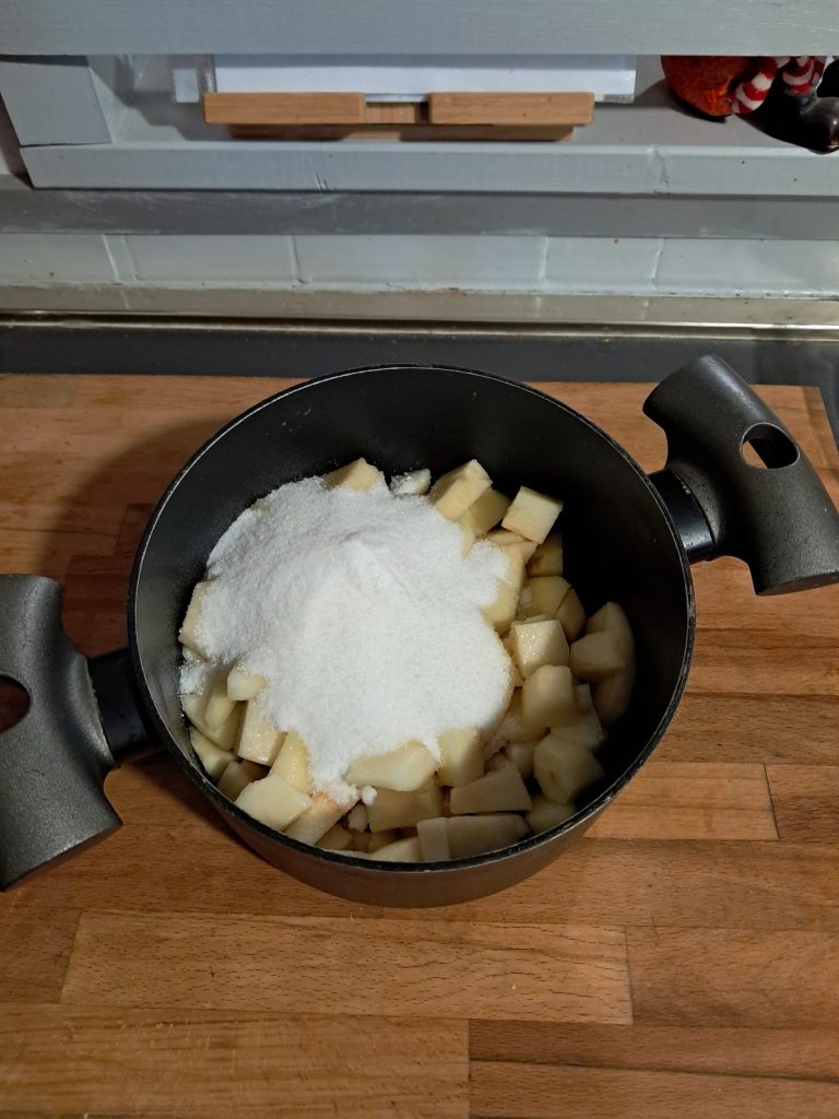 Une fois coupées, transférez les poires dans une casserole avec le sucre et la cannelle.