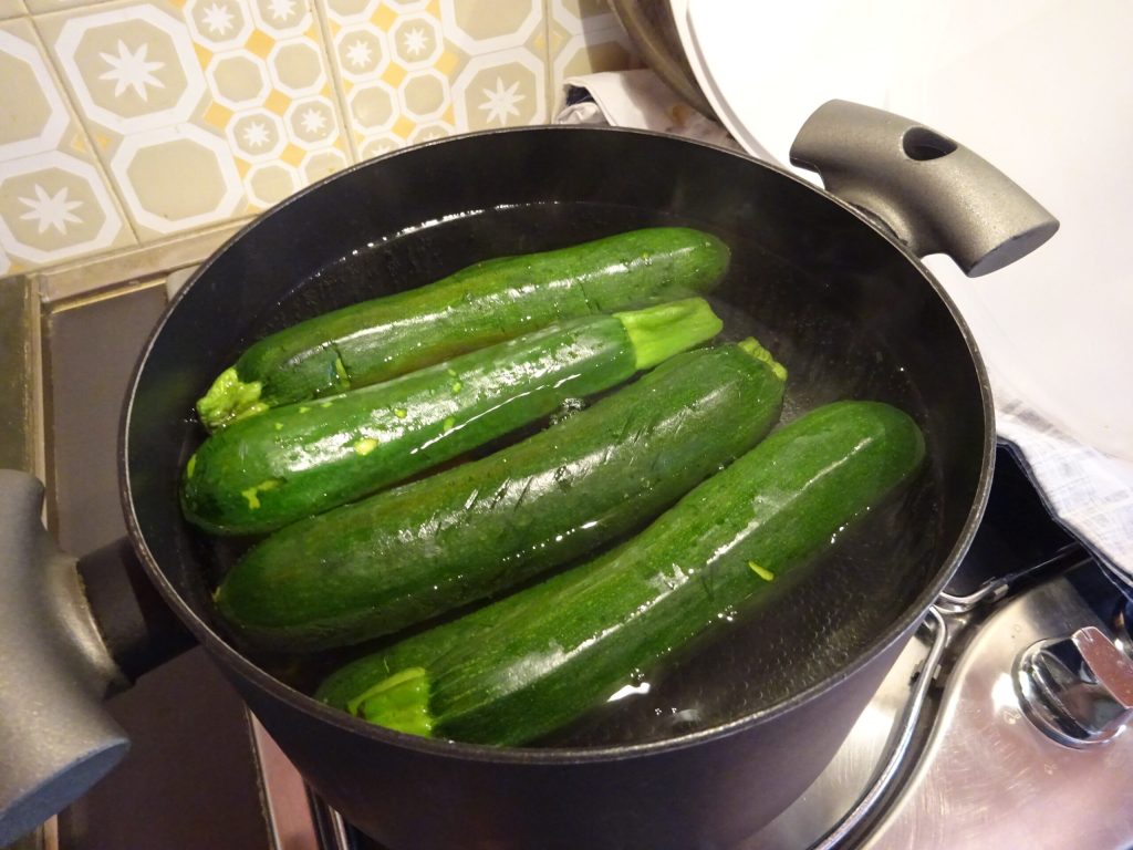 Tout d’abord, lavez les courgettes et mettez-les dans une grande casserole, couvrez d’eau, ajoutez une pincée de sel et faites cuire à feu moyen pendant environ 10 à 15 minutes ou jusqu’à ce qu’elles soient légèrement tendres mais non molles.