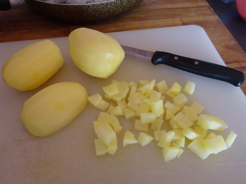 Entre-temps, nettoyez et coupez les pommes de terre en dés d’environ 1 centimètre.