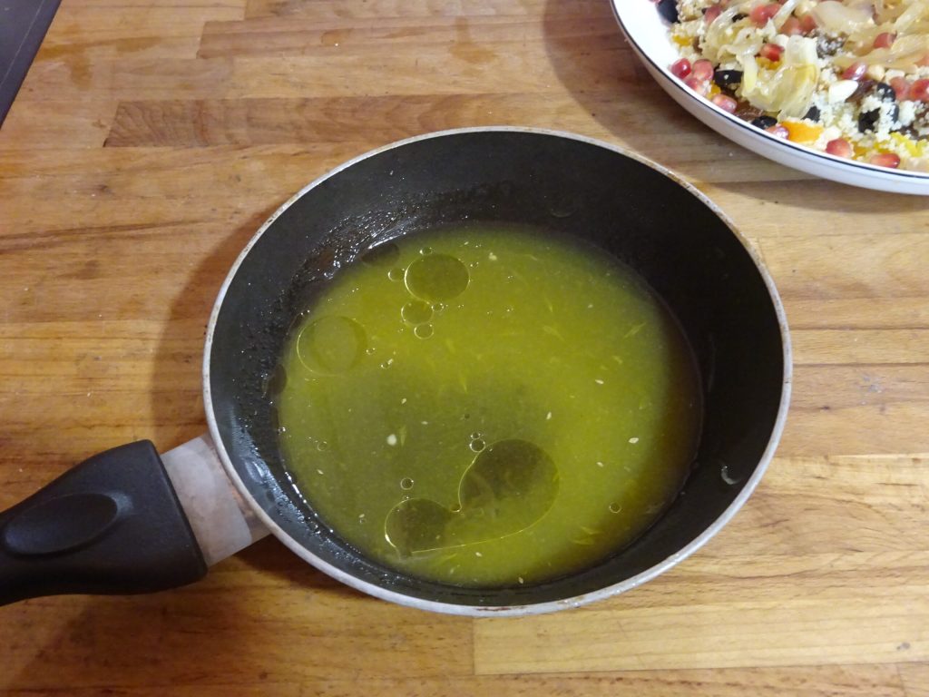 Dans la poêle où vous avez cuit les oignons, versez le jus de l’orange dans lequel vous avez réhydraté les raisins secs, ajoutez une cuillère à soupe d’huile d’olive et 2 pincées de sel.