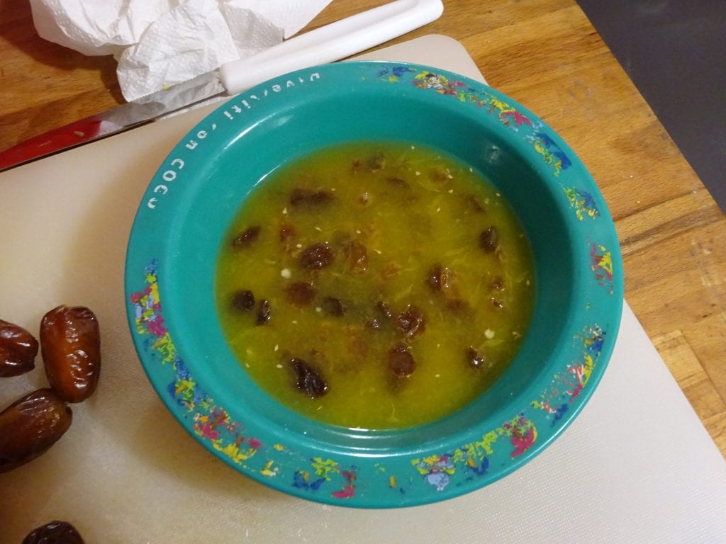 Pressez maintenant l’orange et versez le jus dans un petit bol où vous ajouterez les raisins secs pour les réhydrater.