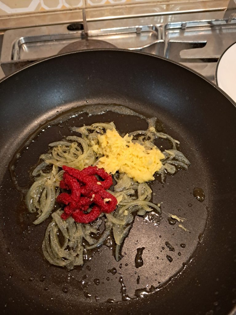 Après les 10 minutes de cuisson de l’oignon, ajoutez le gingembre râpé et le concentré de tomate, mélangez bien pour bien amalgamer et faites cuire environ 10 minutes supplémentaires à feu doux et toujours avec le couvercle.