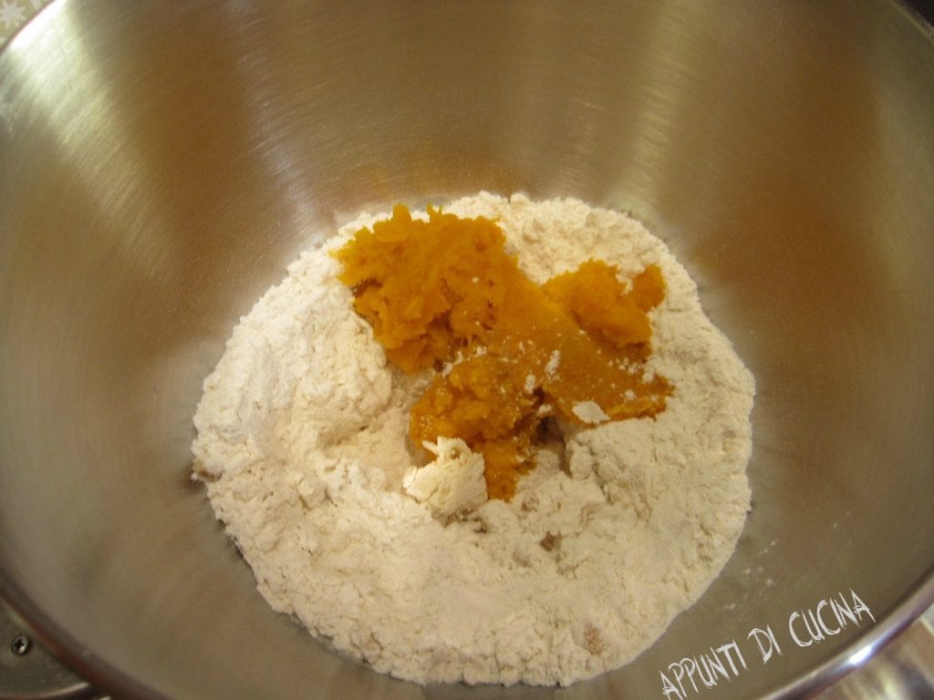 • Versez maintenant la farine blanche, la farine Manitoba, le sel, le sucre et le demi-sachet de levure de boulanger sèche dans un pétrin, puis ajoutez également la purée de citrouille.
