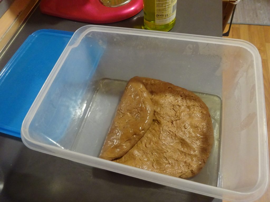 Une fois que la pâte est prête, retirez-la du robot, formez une boule et mettez-la à lever dans un contenant, avec couvercle, préalablement huilé. Laissez lever à température ambiante pendant 3 heures.
