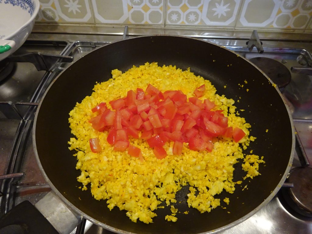 Après 3 minutes, ajoutez le sachet de safran et une cuillère à soupe d’eau. Mélangez pour dissoudre le safran et faites cuire 4/5 minutes toujours à feu moyen.