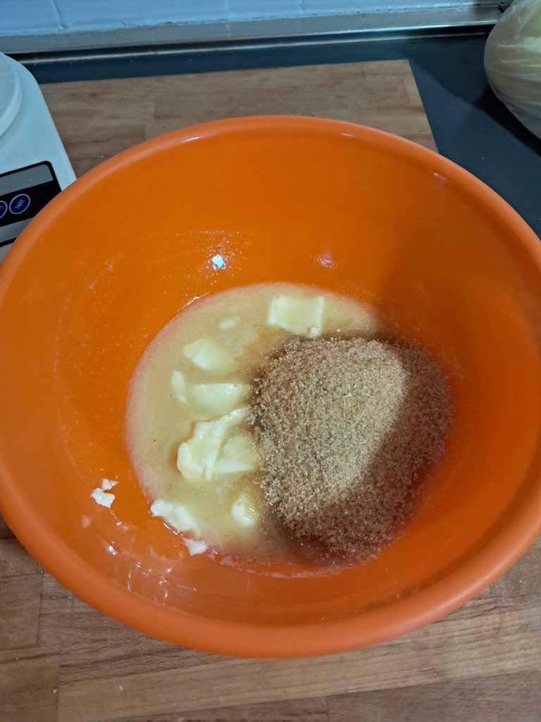 Dans un bol, versez le beurre légèrement fondu, puis ajoutez le sucre de canne et commencez à mélanger avec les fouets jusqu’à obtenir un mélange homogène.