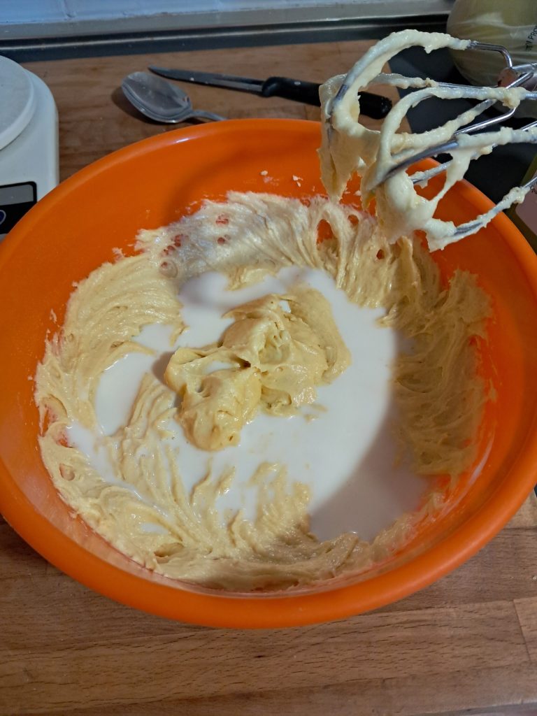Versez maintenant le lait dans la pâte et mélangez jusqu’à l’incorporer bien.