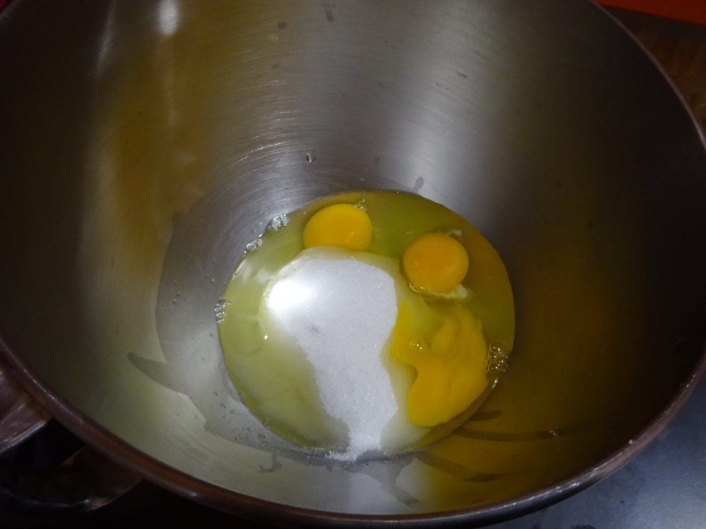 Dans le bol du robot culinaire ou dans un saladier, cassez les œufs et ajoutez le sucre.