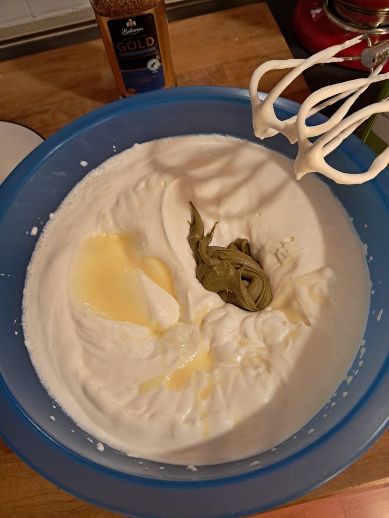 Une fois la crème montée, ajoutez le lait concentré et la crème de pistaches.