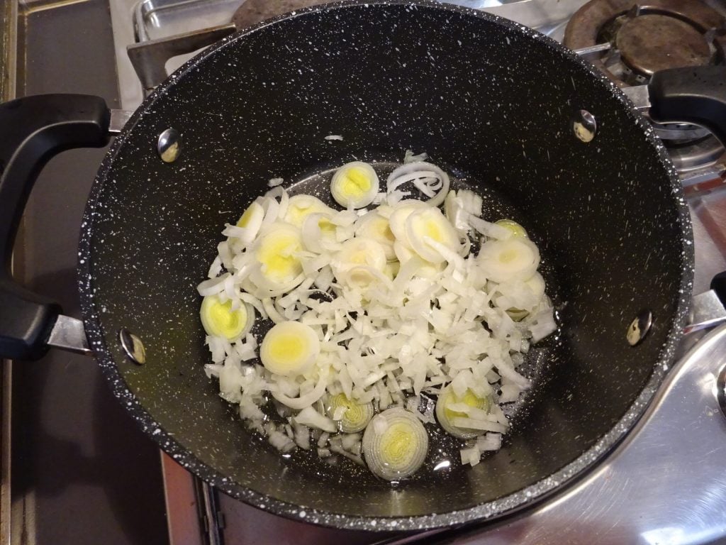 Nettoyez et coupez le poireau en fines rondelles, puis nettoyez et coupez l’oignon en petits dés.