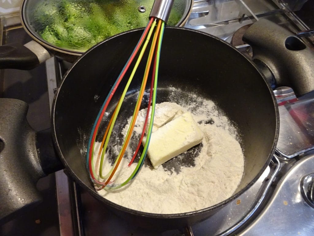 Dans une casserole, versez la farine et le beurre, mettez sur le feu à feu moyen et faites fondre le beurre.