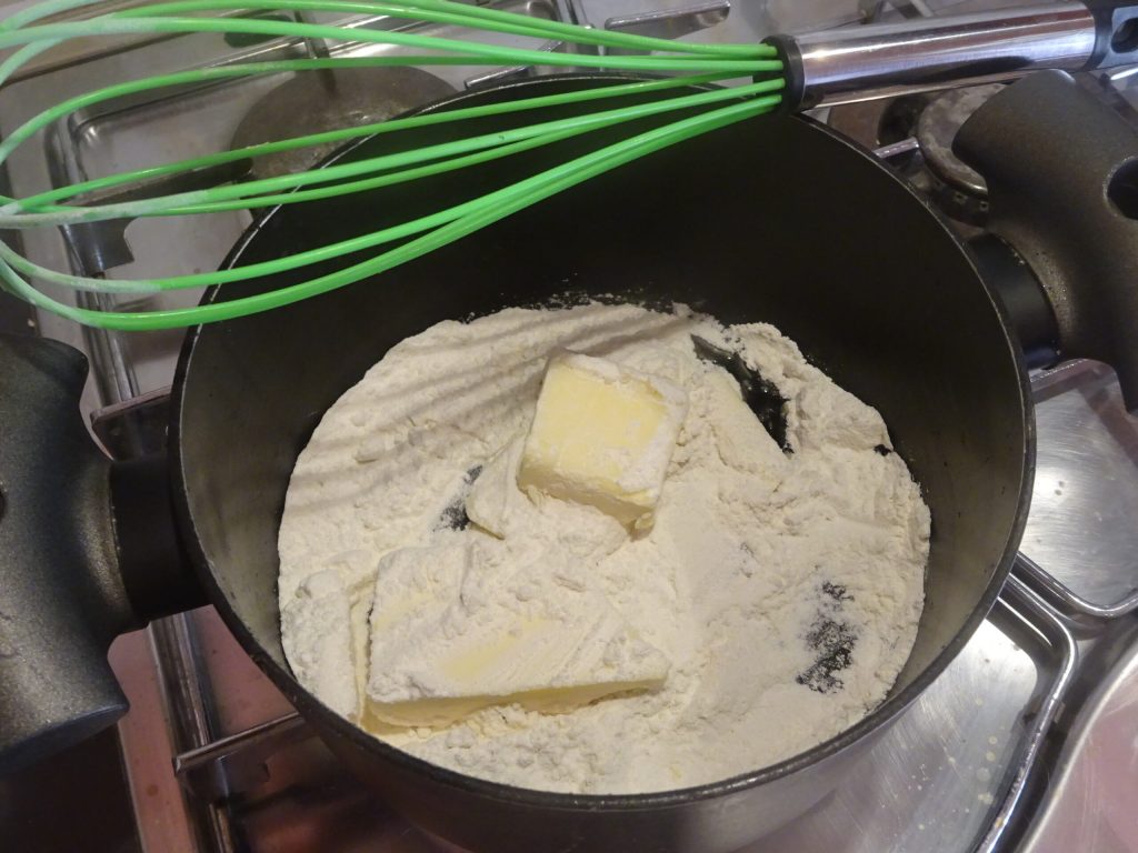 Entre-temps, préparez la béchamel. Chauffez le lait sans le faire bouillir, puis dans une casserole versez la farine et le beurre. Faites fondre le beurre et mélangez avec un fouet pour l’incorporer à la farine.