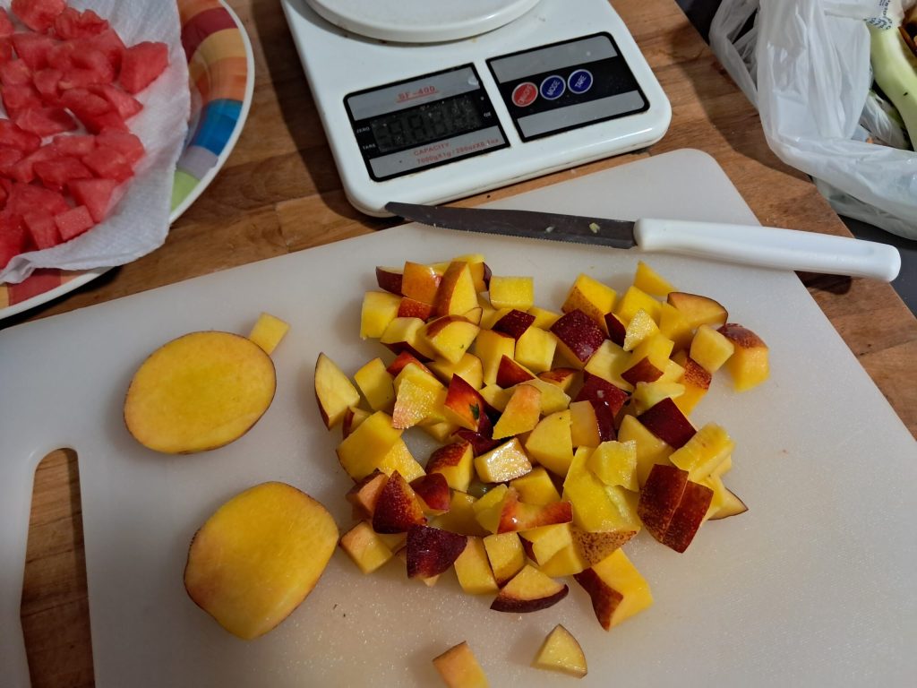 Lavez et coupez les pêches jaunes en cubes.