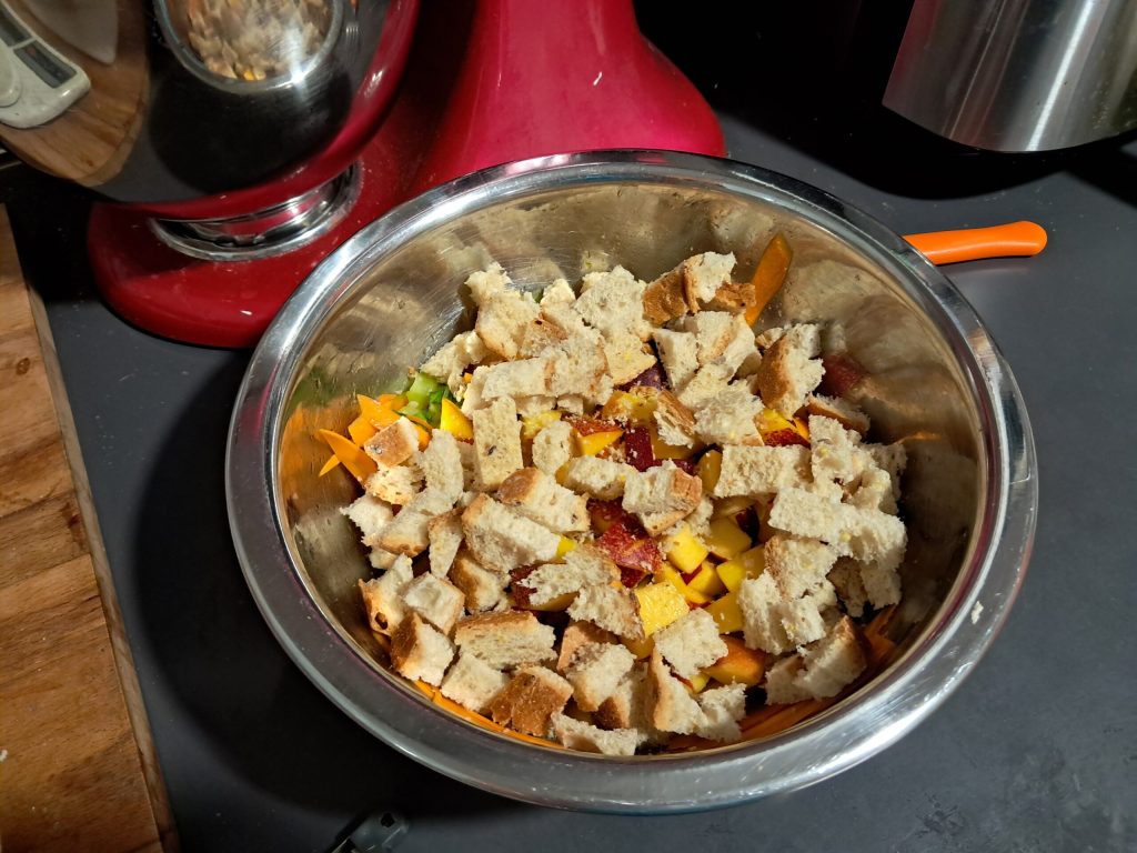 Coupez également le pain rassis en morceaux et ajoutez les pêches et le pain aux légumes.