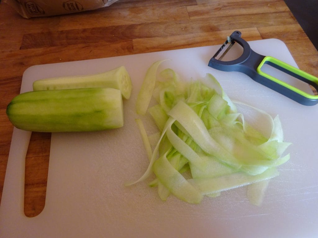 Épluchez le concombre et coupez-le en fines tranches avec un éplucheur.