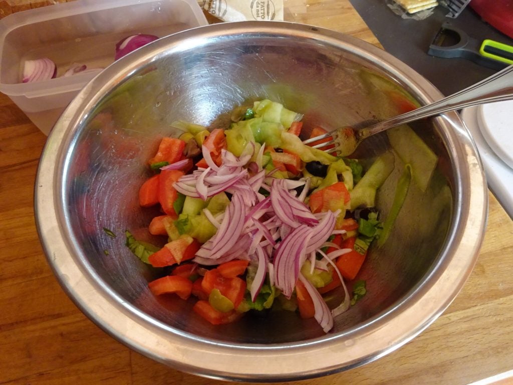 Maintenant, égouttez l’oignon, séchez-le avec du papier absorbant, coupez-le finement et ajoutez-le aux autres légumes.