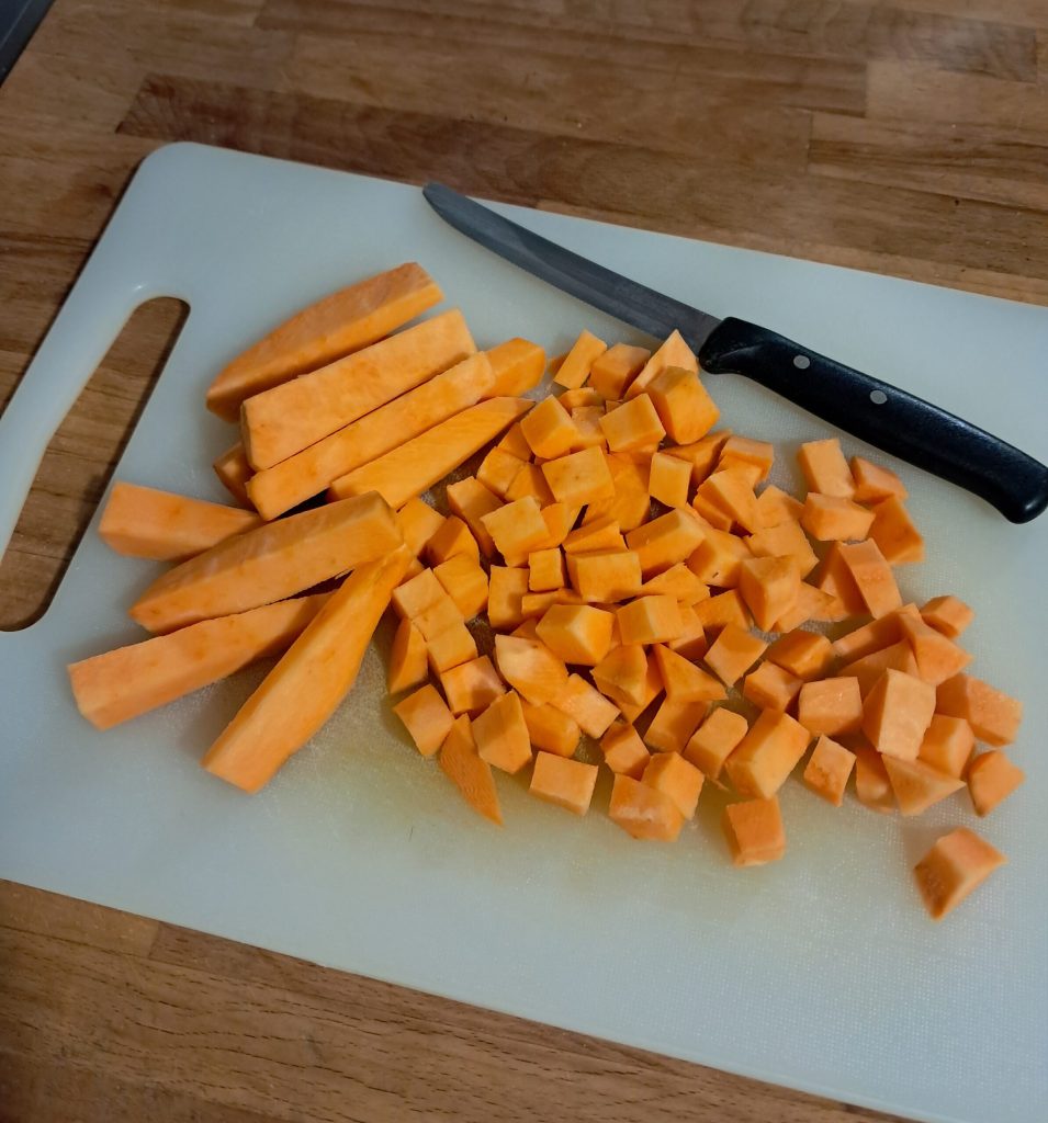 Épluchez la patate douce et coupez-la en dés d’environ 1 centimètre.