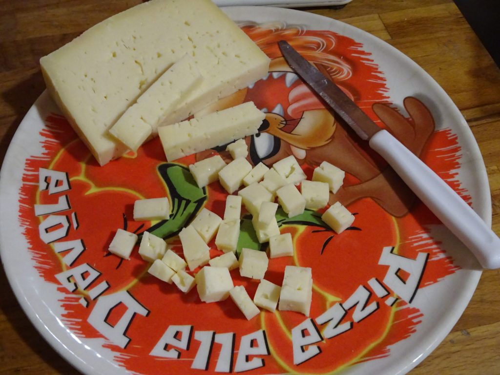 Entre-temps, coupez en dés d’environ 1 centimètre le fromage asiago, coupez également la mozzarella et essuyez-la légèrement avec du papier absorbant pour enlever un peu de liquide en excès.